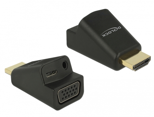 This adapter by Delock can be used to connect e.g. a VGA monitor to a free HDMI interface of the system. Furthermore, it is possible to transfer the audio signal via the Stereo jack female port.