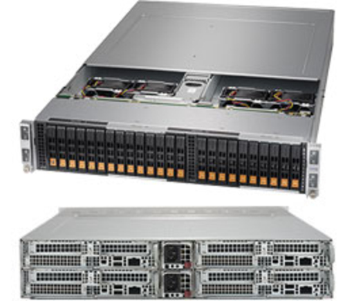 - No-compromise 5th Generation Twin architecture delivers the highest performance and efficiency in a 2U 4-node platform. - The first and only multi-node system that supports the widest TDP range of CPUs (up to 205 watts), fully exploits all memory channels with 24 DIMMS per node and 24 All-Flash NVMe drives - 30% better thermal capacity in a compact 2U form factor enables configurations with the highest performance processor, memory, storage and I/O leveraging the Titanium level 96% efficient PowerStick power supplies (2200W/2600W). - Double the I/O capacity with three PCI-E 3.0 x16 expansion slots (Two low-profile and one SIOM) per node and added flexibility with more than 10 networking options including 2x 1GbE, 10G, 25G,100G, IB and industry leading SIOM modular interconnect - Each node can support current and next generation dual Intel Xeon processors with up to 3TB of memory, 24 drives of All-Flash NVMe, Hybrid NVMe/SATA/SAS, SSD and HDD, plus 2 M.2 NVMe/SATA per node