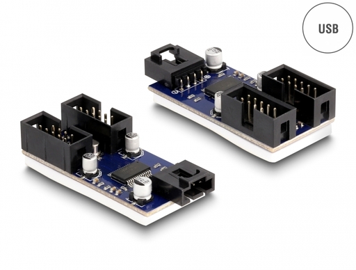 This USB hub by Delock can be connected to an internal USB port and provides two 9 pin USB pin header male connectors. Using a USB pin header cable allows to connect up to 4 USB devices.
