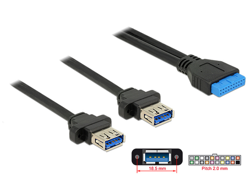 This cable by Delock allows the extension of a USB 3.0 connection and can be used to connect various devices. The female ports can be attached with two screws, e.g. to a slot bracket, a cable duct or an enclosure with the corresponding opening. This can be used to install a USB connector at an easily accessible position. The cable is most suitable for self-designed computer systems as well as the Mini PCIe module 95234 by Delock.