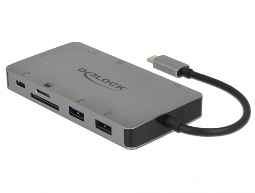 This docking station by Delock can be connected to a computer with a USB-C DP Alt Mode or Thunderbolt 3 port and provides a variety of interfaces. One monitor can be operated at the HDMI or VGA output. Three built-in USB ports allow the use of peripherals, and connections for gigabit network, as well as an SD / micro SD card reader, complete the features.