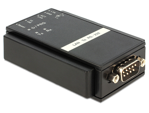 The Delock TCP/IP Ethernet to RS-232 converter by Delock enables you to integrate and control serial devices based on RS-232 via your network. The converter is suitable for DIN rail mounting.