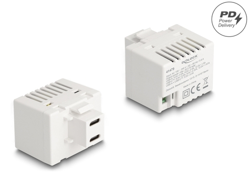This module by Delock provides two USB Type-C Power Delivery (PD) charging ports. The USB charging ports supports common fast charging protocols. Connected devices can be charged with up to 20 W. With its standardised dimensions it can be used for easy snap-in mounting in e.g. a Keystone patch panel, face plate or surface-mount box.
