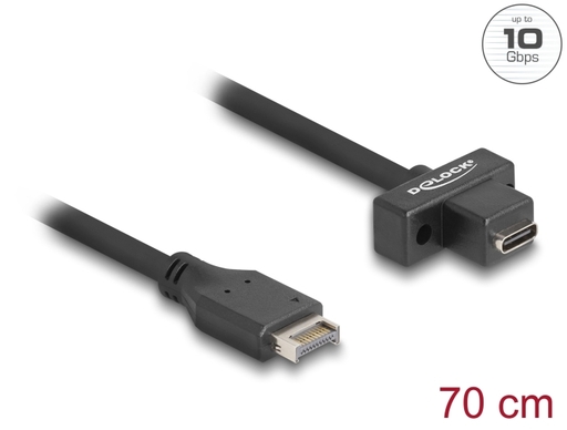 Questo cavo Delock può essere collegato alla presa interna USB 10 Gbps USB Type-E Key A di una scheda madre o di una scheda PCI Express e può essere utilizzato per estendere una connessione USB. Il connettore USB Type-C™ può essere fissato con due viti esistenti, ad esempio su una staffa di alloggiamento o su un telaio con l'incavo corrispondente. In tal modo, è possibile installare un connettore USB in una posizione facilmente accessibile.