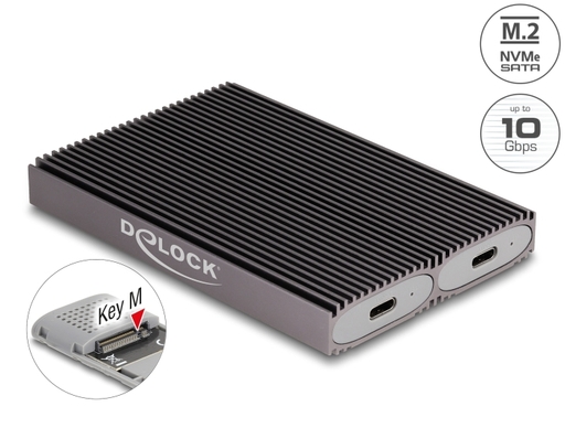 Combo enclosure The big advantage of this Delock M.2 enclosure is that both SATA and PCIe (NVMe) M.2 SSDs can be inserted into the enclosure. The memory is automatically recognized by the chipset and can then be used.