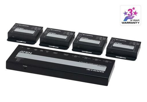 ATEN 4-Port 4K HDMI Cat 6 Splitter with 4 Receivers kit, with local HDMI output, IR receivers, and PoC