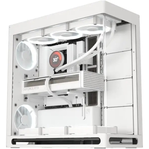 HAVN HS420 WHITE, a premium case that combines cutting-edge design with exceptional functionality. Its dual-chamber architecture enhances airflow for GPU cooling while keeping a compact size. Featuring custom panel ventilation, it can accommodate up to 11 fan positions and 420mm radiators in a variety of setups.