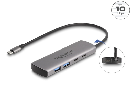 This solid USB hub by Delock with metal housing can be connected to a computer, laptop or mobile device via the USB Type-C interface. It has two USB Type-A connectors as well as two USB Type-C connectors. Different USB devices such as USB flash memory, card reader, external enclosure etc. can be connected.