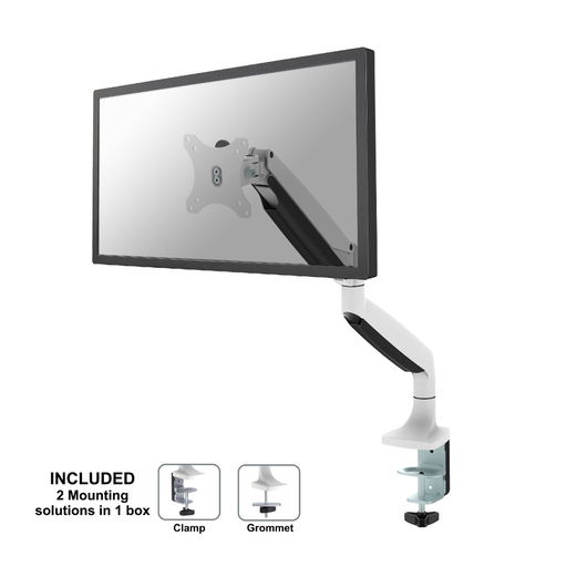 Questo braccio porta monitor Neomounts Select, modello NM-D750WHITE consente di collegare uno schermo LCD/LED/TFT su di una scrivania con la modalità di fissaggio su piano attraverso un morsetto o vite centrale (entrambe sono incluse).