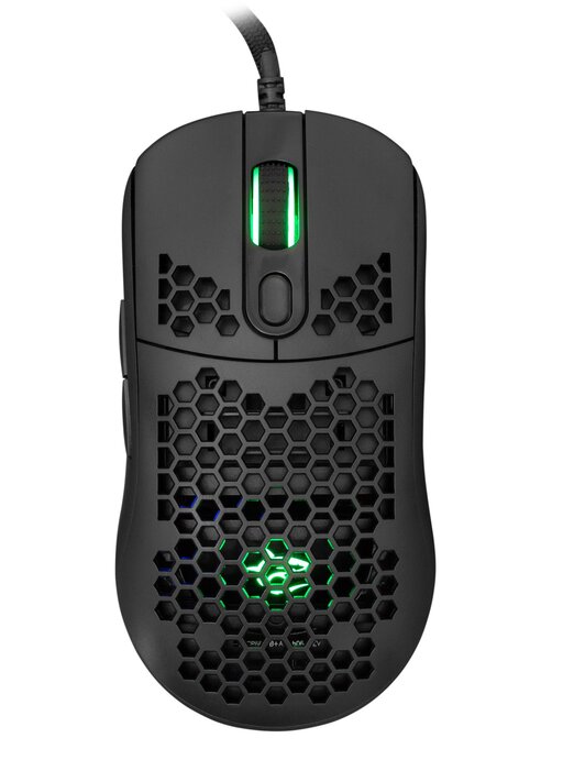Mouse da gioco 6D, con 6 pulsanti. Chipset SUNPLUS 6651 interno con DPI regolabile fino a 6400 DPI. La caratteristica principale di questo modello è la sua leggerezza, pesa solo 101 g. Gli interruttori HUANO garantiscono una durata fino a 10 milioni di clic. E il mouse ideale per i gamer!