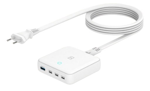 Alimentatore compatto da scrivania 100W con 4 porte e cavo da 1,5 m Alimentatore compatto da scrivania con quattro porte da 100W, di cui tre con uscita USB-C Power-Delivery e una con uscita USB-A Quick Charge 3.0. Dotato di tecnologia GaN, che lo rende compatto e potente, l’alimentatore universale da 100W può ricaricare simultaneamente anche 4 dispositivi offrendo una potenza in uscita complessiva da 100W, in grado di ricaricare un iPhone fino all’80% in 50 minuti, un iPad Pro in 52 minuti e un MacBook Pro 16" in 90 minuti. L’alimentatore da scrivania può essere utilizzato solo tramite presa da parete. Il cavo di alimentazione, con spina europea, è lungo 1,5 mt.