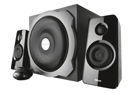 2.1 speaker set including wooden subwoofer with a total RMS power output of 60 Watt (120 Watt peak power)