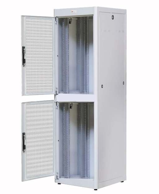 • Porte frontali grigliate, con cerniere a sgancio rapido e maniglia con serratura a chiave
