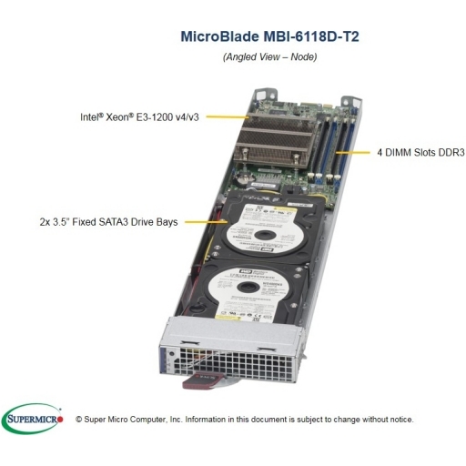 MBI-6118D-T4 / MBI-6118D-T2 Each Node Supports: 1 Intel Xeon processor E3-1200 v3 Intel C224 chipset 2x 1Gb/s network connectivity per node Up to 32GB DDR3 VLP UDIMM in 4 DIMM slots 4x 2.5" 6Gb/s SATA3 HDDs/SSDs (MBI-6118D-T4) 2x 3.5" 6Gb/s SATA3 drives (MBI-6118D-T2)