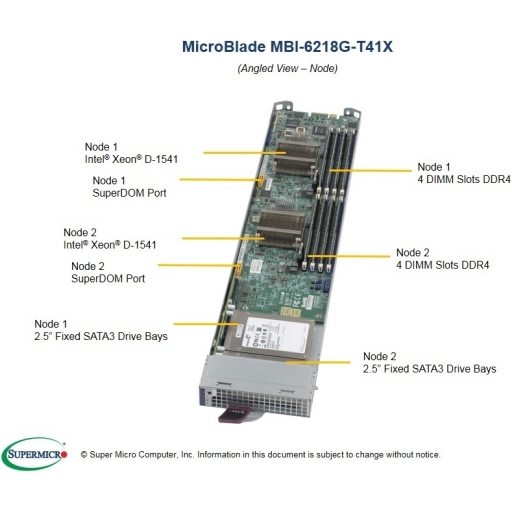 The Supermicro MicroBlade represents an entirely new type of computing platform. It is a powerful and flexible extreme-density 6U/3U all-in-one total system that features 28/14 hot-swappable MicroBlade Server nodes supporting 28/14 Newest Dual-Node Xeon UP systems with Intel E3-1200 v6/v5 family configurations with up to 2 SSDs/1 HDD per Node. The 6U/3U MicroBlade enclosure can incorporate up to 2 Chassis Management Modules, and up to 2 Switch Modules for efficient, high-bandwidth communications. It can incorporate up to 8 redundant (N+1 or N+N) 1600/2000W high-efficiency (95%/96%) power supplies with cooling fans. This innovative new generation architecture includes server, networking, storage, and unified remote management for Cloud Computing, Video Streaming, Content Delivery, Social Networking, Desktop Virtualization and Remote Workstation applications. - Single socket FCBGa 1667, 8-Core, 45W, 16 Threads; support Intel Xeon processor D-1541\n- Up to 128GB DDR4 VLP ECC RDIMM 2133/2400MHz in 4 sockets\n- 1x 2.5" 6Gb/s SATA3 HDD/SSD, 1x SATA3 DOM\n- Dual 10GbE ports via Intel X552\n- 56 Xeon D-1541 nodes in 6U or 28 Xeon D-1541 nodes in 3U\n- Hot-plug front loading