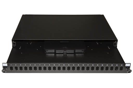 Box di giunzione per fibra ottica, occupa 1 unitÓ nellÆarmadio rack. Pannello estraibile per fibra ottica in acciaio con 24 porte per inserimento degli adattatori fibra ottica e dei pigtail. LÆinterno Þ giÓ equipaggiato per lÆinstallazione dei pigtail, con una cassetta di giunzione splice box da 24 fibre, guidacavi, 24 tubetti termorestringenti, viti fissaggio adattatori. Con 4 asole passacavi aperte per veloce rimozione del pressacavo ed agevole estrazione del vassoio. Ampio ingresso posteriore con premarcato removibile per eventuale giunto di spillamento. Colore nero RAL9005 Moduli e pigtail non inclusi. Il cassetto pu= essere estratto e inclinato verso il basso, agevolando la lavorazione. Installabile su armadio rack 19" grazie alle staffe 19" incluse, regolabili per variare la profonditÓ a cui mettere il cassetto. Conforme agli standard sul cablaggio in fibra ottica.