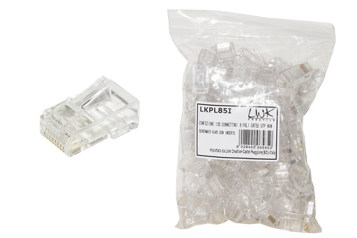 Plug per reti categoria 5E RJ45 8P8C non schermati UTP con inserto esterno per agevolare l'inserimento dei fili nel connettore. Risolve il problema di infilare i filli del cavo rete nel connettore nella giusta sequenza, condizione necessaria per il rispetto delle prestazioni del cavo. Prima si posizionano i fili nell'inseritore esterno nella sequenza voluta, poi si infila l'inseritore nel connettore e si crimpa con la pinza. E' molto pi¨ agevole che inserire i conduttori nel connettore uno ad uno. Connettori per assemblare cavi di rete categoria 5e, telefonia, ecc. Per cavo flessibile (conduttori multifilari), anche per uso POE. Cicli di Accoppiatore: maggiore 750 Forza di inserimento: minore 20N Materiale dei contatti: Bronzo fosforoso Rivestimento dei contatti: Nichel, placcato oro Materiale del corpo del connettore: Policarbonato, trasparente Diametro del conduttore di rame: AWG (27/7 ... 24/7) Gamma di temperatura: -40¦C ... +80¦C Diametro del rivestimento esterno: 3,2 ... 5,5 mm Carico di corrente: 1,5 A a 50¦ C Facile montaggio con pinza modulare LKCRIMP