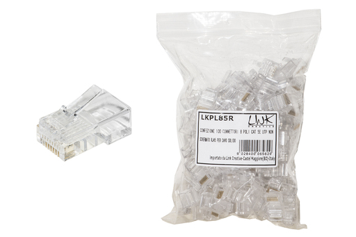 Plug per reti categoria 5E RJ45 8P8C non schermati UTP. Connettori per assemblare cavi di rete categoria 5e, telefonia, ecc. Per cavo solido (conduttori unifilari), anche per uso POE. Cicli di Accoppiatore: maggiore 750 Forza di inserimento: minore 20N Materiale dei contatti: Bronzo fosforoso Rivestimento dei contatti: Nichel, placcato oro Materiale del corpo del connettore: Policarbonato, trasparente Diametro del conduttore di rame: solido AWG (27 ... 24) Gamma di temperatura: -40¦C ... +80¦C Diametro del rivestimento esterno: 3,2 ... 5,5 mm Carico di corrente: 1,5 A a 50¦ C Facile montaggio con pinza modulare LKCRIMP