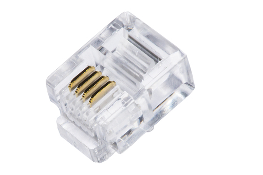 Confezione 100 Connettori telefonici 6 posizioni 4 contatti, tipicamente in uso nei cavi telefonici.