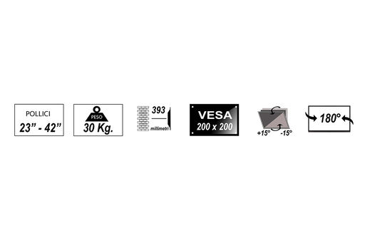 Braccio in acciaio per montaggio a muro di TV/monitor/video LED e LCD piatti e ultra piatti. Ognuno dei 3 snodi permette la relazione della TV in orizzontale di 180¦, dando la possibilitÓ di orientare a piacimento il monitor. Regolazione verticale +/-15¦ Placca di montaggio a muro molto robusta a 7 fori. Clip per cavi incluse per organizzare i cavi. Installazione del monitor semplificata grazie ai fori sulla placca a occhiello. Larghezza dal braccio 30x15, in acciaio 1.2mm. Estensione massima del braccio 393mm. Per schermi 23-42" fino a 30 kg, compatibile con standard VESA 75x75, 100x100, 200x100, 200x200. Colore nero.