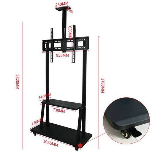 Il supporto per monitor ha la funzione di reggere un monitor, video, o TV. Supporto per TV o video da 42" a 100" (VESA minimo 300x600), massimo 900x600. Supporta TV fino a 120 Kg. Per TV di grande formato, Molto stabile, grazie alle sue 4 gambe con ruote. Altezza massima 2320 mm (con supporto telecamera). Altezza massimo supporto TV 1780mm. Ruote bloccabili incluse. Misure ripiano telecamera: 250x125 mm. Misure ripiano 340x730 mm. Misure ripiano basamento 1055x470 mm. Viene spedito smontato.