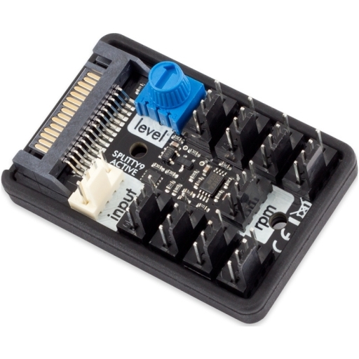 SPLITTY9 ACTIVE has significant advantages over a passive splitter: Power supply through SATA connector: Fans connected to the splitter are not supplied from the fan output, but from a SATA power connector to be connected directly to the PSU. This means that fan power consumtion is not limited to the maximum load of the fan output, but to the maximum power of a SATA connector that is 4.5 Amps or 54 Watts according to specification. PWM signal amplification: When using a passive splitter, each connected fan puts a strain on the PWM signal of the fan output depending on fan output and fan type, even a small number of fans might overload the PWM signal, the fans cannot be controlled in this case. SPLITTY9 ACTIVE amplifies the PWM signal to be able to control problematic fans with out-of-spec PWM inputs. Adjustable switching threshold: PWM fans can usually not be switched off using the PWM signal SPLITTY9 ACTIVE adds this useful feature. A rotary knob can be used to adjust the switching threshold. If the PWM signal is below the threshold, SPLITTY9 ACTIVE will cut power to the fans. A LED on the splitter indicates whether the fans are currently powered.