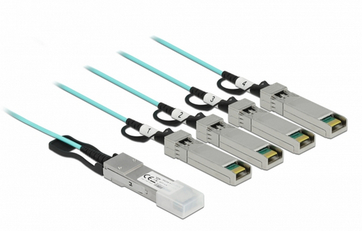 This active optical cable by Delock is used to connect devices to a switch with a QSFP+ port or to connect two Ethernet switches.