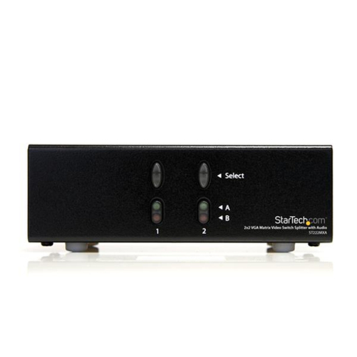 Lo switch/sdoppiatore matrice VGA 2x2 ST222MXA consente di condividere fino a 2 sorgenti VGA distinte (con relativo segnale audio) tra 2 display o proiettori indipendenti. Grazie al comodo tasto di scelta rapida, lo switch/sdoppiatore matrice VGA consente di commutare ciascuno dei 2 segnali VGA in ingresso in modo indipendente con il corrispondente audio; in questo modo, è possibile visualizzare sorgenti diverse su ogni singolo display o la stessa sorgente su entrambi i monitor per il massimo della flessibilità e del controllo. Per garantire distribuzione VGA e gestione del segnale ottimizzate, anche su lunghe distanze di trasmissione, lo switch matrice VGA ST222MXA è dotato di booster di segnale incorporato che consente l'installazione di display anche a 65 m di distanza dalla sorgente, sempre mantenendo l'integrità del segnale. Con garanzia StarTech.com di 2 anni e supporto tecnico a vita gratuito.