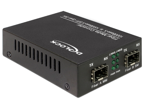 This Gigabit Ethernet Media Converter by Delock can be used to connect different optical media. For example, multimode fiber can be converted to singlemode fiber. In the SFP slots, various optional 1 Gb/s SFP modules by Delock can be used.