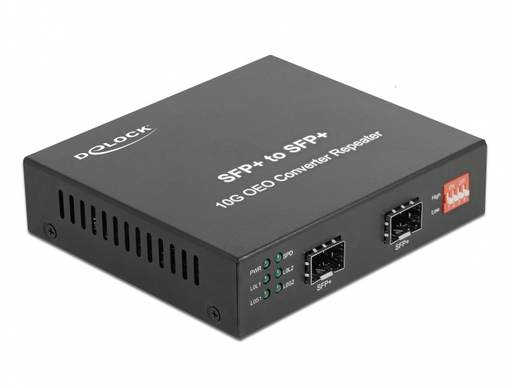 This 10 Gigabit Ethernet Media converter by Delock can be used to connect different optical media. For example, Multi-mode fiber can be converted to Single-mode fiber. In the SFP slots, various optional 10 Gbps SFP+ modules by Delock can be used.