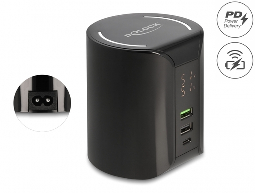 This USB Power Delivery (PD) charger by Delock can be used to charge smartphones and tablets. It provides various voltages from 5 V to 12 V on the USB Type-C port and power up to 58 watt. In addition, one USB Type-A port with fast charging technology and one USB Type-A port with 2.4 A are available.