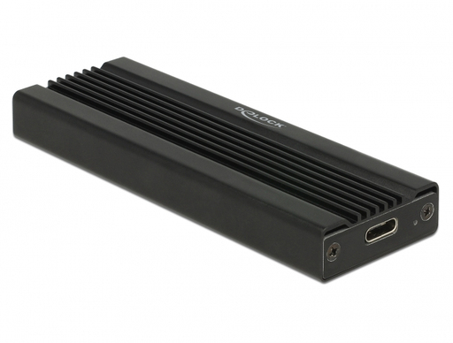 This enclosure by Delock enables the installation of an M.2 PCIe NVMe SSD in 2280, 2260, 2242 and 2230 format, it can be connected via USB to the PC or laptop. The robust metal housing with cooling fins on the top ensures an optimum temperature of the memory.