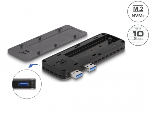 This enclosure by Delock enables the installation of an M.2 PCIe NVMe SSD in 2280, 2260 and 2242 format. It connects directly to the PS5 with the two USB Type-A connectors. The robust metal housing with air vents at the sides ensures an optimum temperature of the memory.
