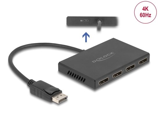 This splitter by Delock receives an DisplayPort signal from a PC or laptop and splits it to four connected displays. Thereby one DisplayPort connection can be used to operate four DisplayPort monitors.