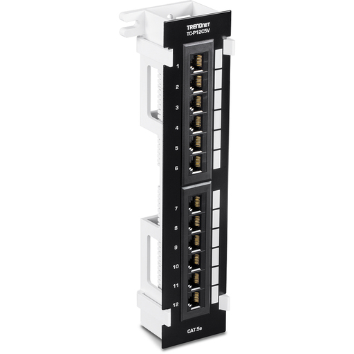Il Pannello Patch per il Montaggio a Parete Non Schermato Cat5e 12 porte di TRENDnet, modello TC-P12C5V, fornisce una connessione 100MHz a 12 porte Ethernet Gigabit RJ-45. Questo pannello di 10 pollici, è idoneo per applicazioni domestiche e di PMI. Organizzare collegamenti con la superficie di scrittura disponibile sopra ogni porta che consente agli utenti di etichettare i rispettivi collegamenti. Questo pannello patch 12 porte compatto include anche una staffa per il montaggio a parete 89D per installazioni verticale od orizzontale. Il design della staffa di montaggio a parete in stile a scatto fornisce un accesso rapido e semplice ai collegamenti del cavo quando è necessario per l'installazione o la risoluzione di problemi. Usare con lo Strumento Punzone di TRENDnet, modello TC-PDT, e RJ-11/RJ-45 Strumento Crimp/Cut/Strip, modello TC-CT68.