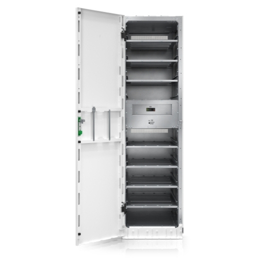 Modular battery cabinet for extended runtime for UPSs with internal batteries. The cabinet is supplied without batteries, so modular battery strings must be purchased separately. Up to 9 battery strings can be installed and monitored in the cabinet.