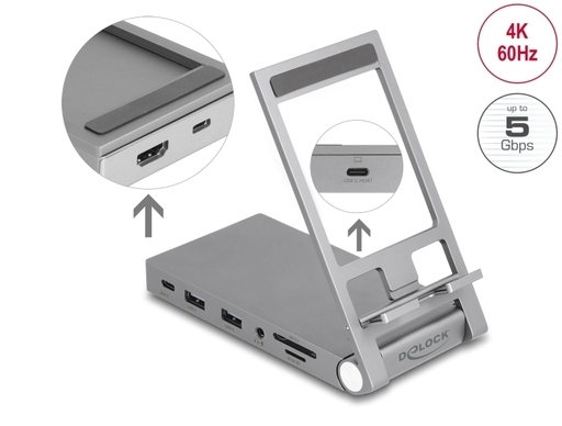 This docking stand for tablets and laptops with holder by Delock convinces not only with its design, but also with stability and function. The rubber pads attached to the bottom side and in the holder ensure that neither the device nor the holder slips.