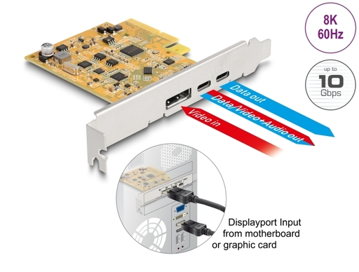 Video output at USB-C port By using the included cable, the DisplayPort connector of the PCI Express card can be connected to a DisplayPort output of a graphics card on the motherboard. Therefore one USB-C port will be DP Alt Mode capable. A monitor can be connected to this port in order to transmit video and audio signals. The maximum resolution of the output depends on the input signal.