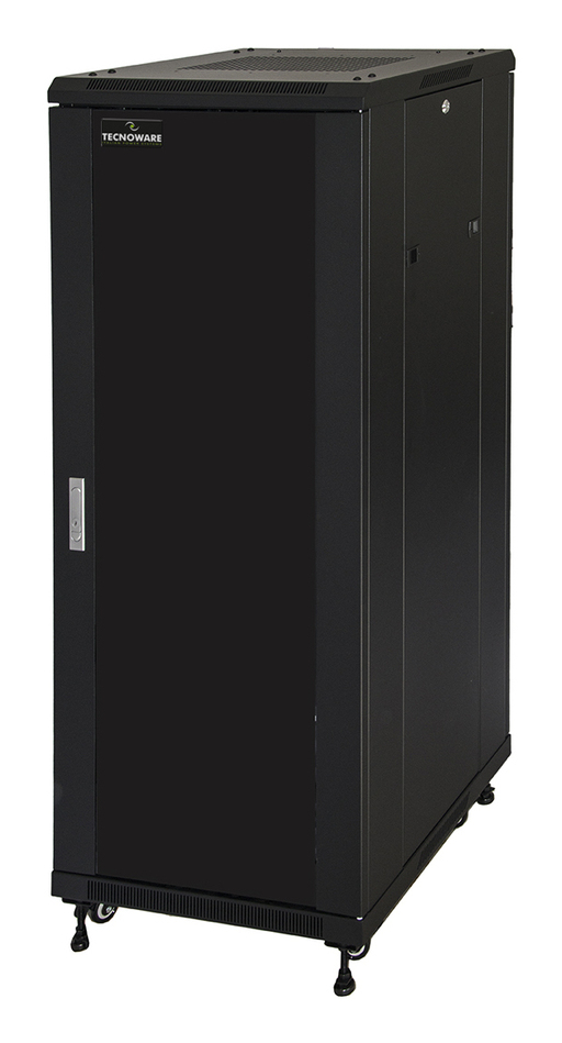 ARMADIO A PAVIMENTO SERIE FLOOR PRO 19" 22 UNITÀ, L600XP600XH1166, porta con maniglia a chiave, apertura porta anteriore a 180°, apertura porta reversibile, ingresso cavi lato superiore e inferiore, Il basamento ha 7 aperture richiudibili per l'accesso dei cavi da diverse posizioni, 4 montanti laterali verticali da 19" regolabili in profondità, pannelli laterali removibili, colore nero, capacità di carico: 800 Kg