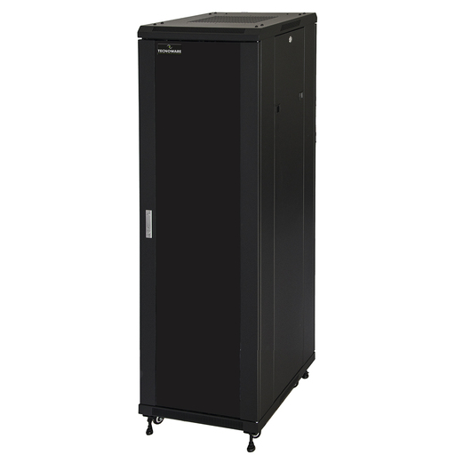 ARMADIO A PAVIMENTO SERIE FLOOR PRO 19" 42 UNITÀ, L600XP600XH2055, porta con maniglia a chiave, apertura porta anteriore a 180°, apertura porta reversibile, ingresso cavi lato superiore e inferiore, Il basamento ha 7 aperture richiudibili per l'accesso dei cavi da diverse posizioni, 4 montanti laterali verticali da 19" regolabili in profondità, pannelli laterali removibili, colore nero, capacità di carico: 800 Kg