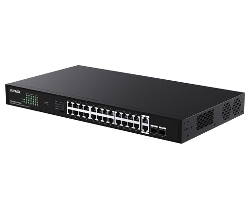 ICIP-G1128P-24 è uno switch Ethernet gigabit PoE non gestito, progettato da Tenda. Lo switch fornisce 24 porte PoE gigabit, 2 porte RJ45 gigabit uplink e 2 porte SFP. Supporta lo standard IEEE 802.3af/at e può rilevare automaticamente i PD e fornire alimentazione. La potenza massima in uscita di una singola porta è di 30W e la potenza dell intero switch di 410W.