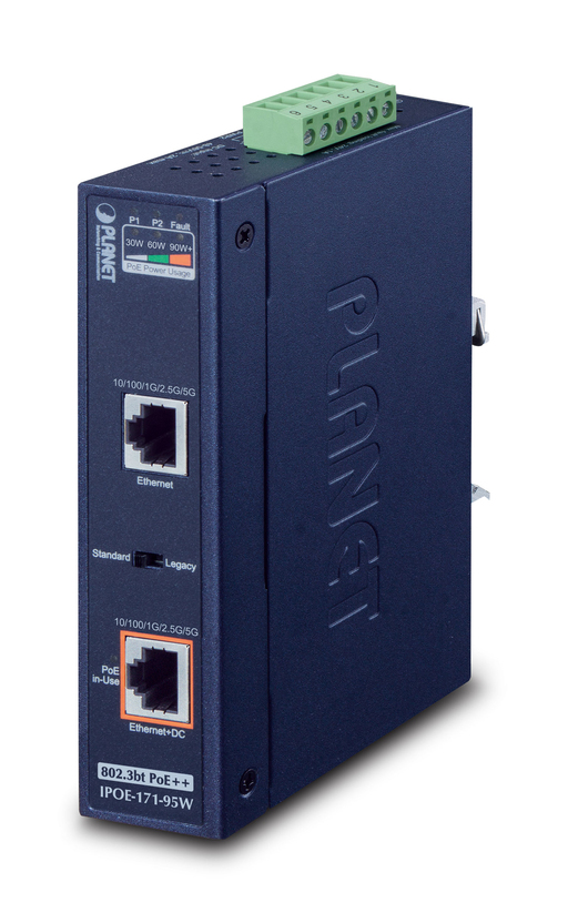 PLANET IPOE-171-95W is a Single-Port, Industrial 802.3bt Power over Ethernet Injector with a maximum of up to 95 watts of power output over Ethernet cables. It is also equipped with two 100M/1G/2.5G/5GBASE-T RJ45 copper interfaces to handle extremely large amounts of data transmission.