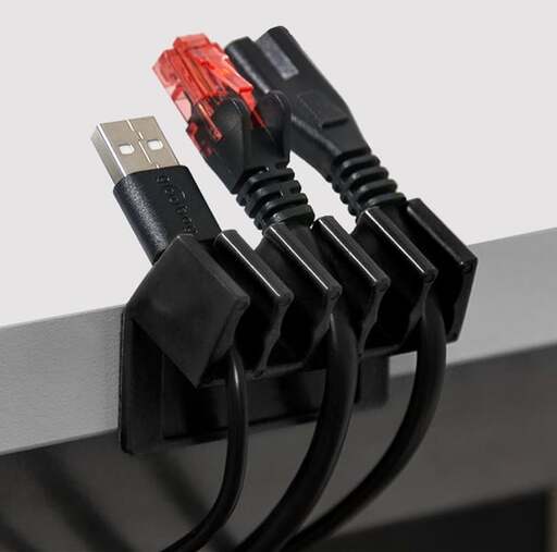 Guide fermacavo per una gestione ordinata dei cavi sulla scrivania. Tutti i cavi possono essere mantenuti in ordine, evitando il loro scivolamento dietro o sotto la scrivania stessa. Questi fermacavi possono essere utilizzati anche per gestire il passaggio dei cavi sotto la scrivania.