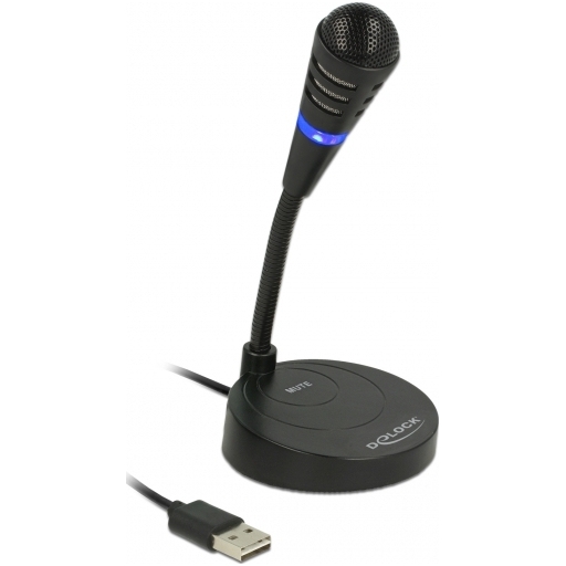 Questo microfono USB Delock pu essere utilizzato per trasmissioni voce e vocali. La base in gomma fornisce un supporto antiscivolo e il collo d'oca consente al microfono di piegarsi nella direzione ideale. L'anello LED indica che il microfono pronto per l'uso attraverso una luce blu o rossa e con il tasto per la funzione mute touch pu essere utilizzato per disattivare il microfono.