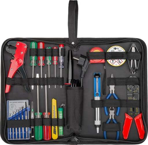 1 pz. saldatore 30 W, 1 pz. pompa dissaldante, 1 pz. filo di saldatura senza piombo, 1 pz. grasso per saldatura, 6 pz. cacciaviti (a taglio e croce ciascuno da 3 pz. 75 mm, 5 pz. 75 mm, 6 pz. 125 mm), 1 pz. comparatore di fase, 1 pz. set di 6 cacciaviti per meccanica di precisione, 1 pz. pinza piatta, 1 pz. tronchese, 1 pz. coltello multiuso con lame snap-off, 1 pz. pinzetta, 1 pz. pinza, 1 pz. crimpatrice, 1 pz. pinza spellacavi, 1 pz. metro a nastro.